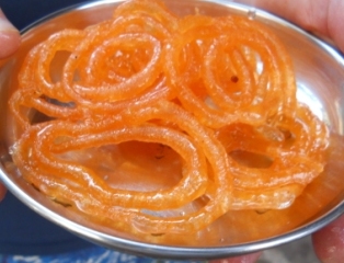 jalebi (deep fried sugary dough strands dunked in sugar syrup)