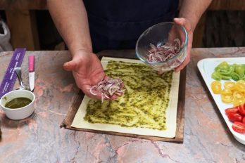 - Sprinkle the onions over the pesto.