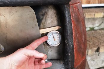 - Make sure the oven is ready by moving the embers behind the heat deflector and clearing the floor. Use your large peel to pick up the pastry on the Teflon sheet and put it in the oven.