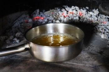 If using a metal oven, leave a bed of embers in the oven and add small pieces of kiln-dried wood as necessary to keep the temperature up to around 180C.