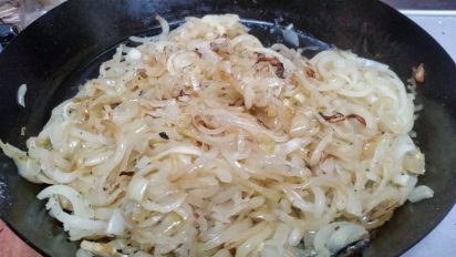 - Peel and slice 12 onions. This may sound a lot but they will reduce right down so accept those tears, sharpen you knife and get slicing.
