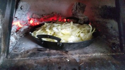 Today is a dank, damp and dreary November day in need of a cheering and warming lunch. We have a surfeit of onions at the moment and cheese so French onion soup sprang to mind. We love coming up with new ways of using our woodfired ovens so we can tell the students on our courses how we’ve been using them so here’s what we did for 4 servings, using the oven like a hob –