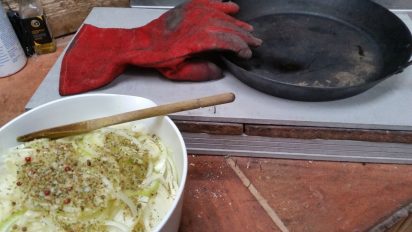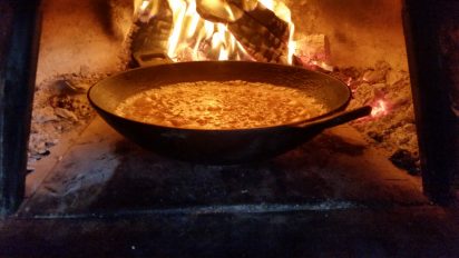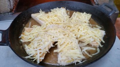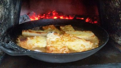 - Put the pan back in the oven towards the embers. Add bits of kindling to get some flames to grill the cheese. Turn the pan so you get an even grilling but be careful as it will be full of the hot soup.